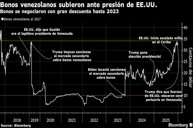 Los títulos en default emitidos por Venezuela y su petrolera estatal PDVSA se dispararon a primera hora del lunes y los bonos soberanos con vencimiento en 2027 subieron 7 centavos por dólar —o 22%—, la mayor alza desde 2023. Eso los llevó a 40 centavos, el doble de su nivel de hace apenas seis meses, aunque aún por debajo de lo que los inversionistas consideran un posible valor de recuperación si el país avanza en una reestructuración de su deuda.